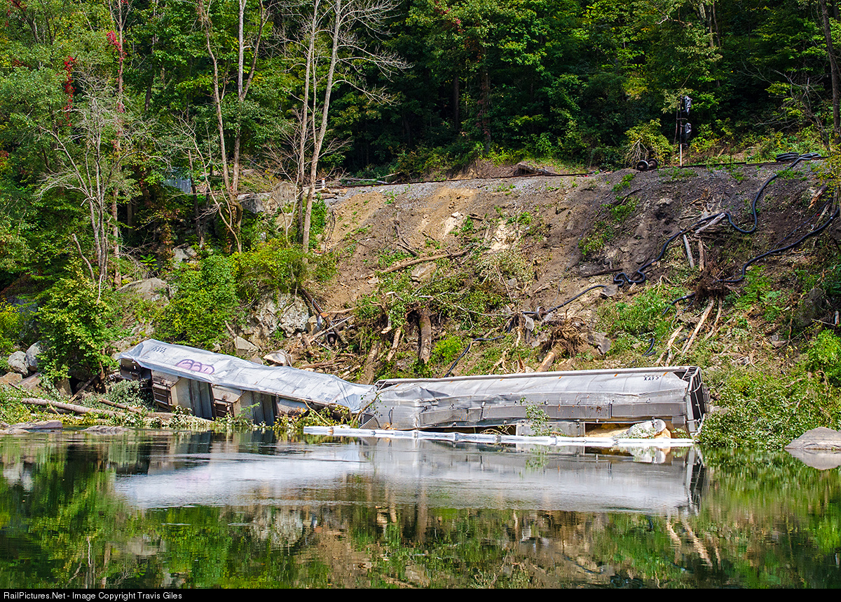 A eastbound grain train looks to have picked the siding switch below the famed New River bridge. Most of the derailment has been cleaned up but these two derailed cars are going to take some work to get out after rolling down the hill into the New River.