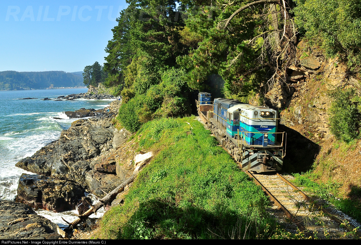 Freight train of cellulose #50.553 of FEPASA from Coronel harbour, exit of the tunnel No. 7 in railway branch Concepción - Horcones (former Curanilahue), and bordering the Pacific Ocean with destination CELCO cellulose plant in Horcones, Arauco city. The area of picture is known as "twins tunnels" ("Túneles Gemelos") as there are 2 tunnels exactly alike and separated by a few meters (behind the photographer in the picture). See this picture, train in the opposite direction: http://www.railpictures.net/photo/499195