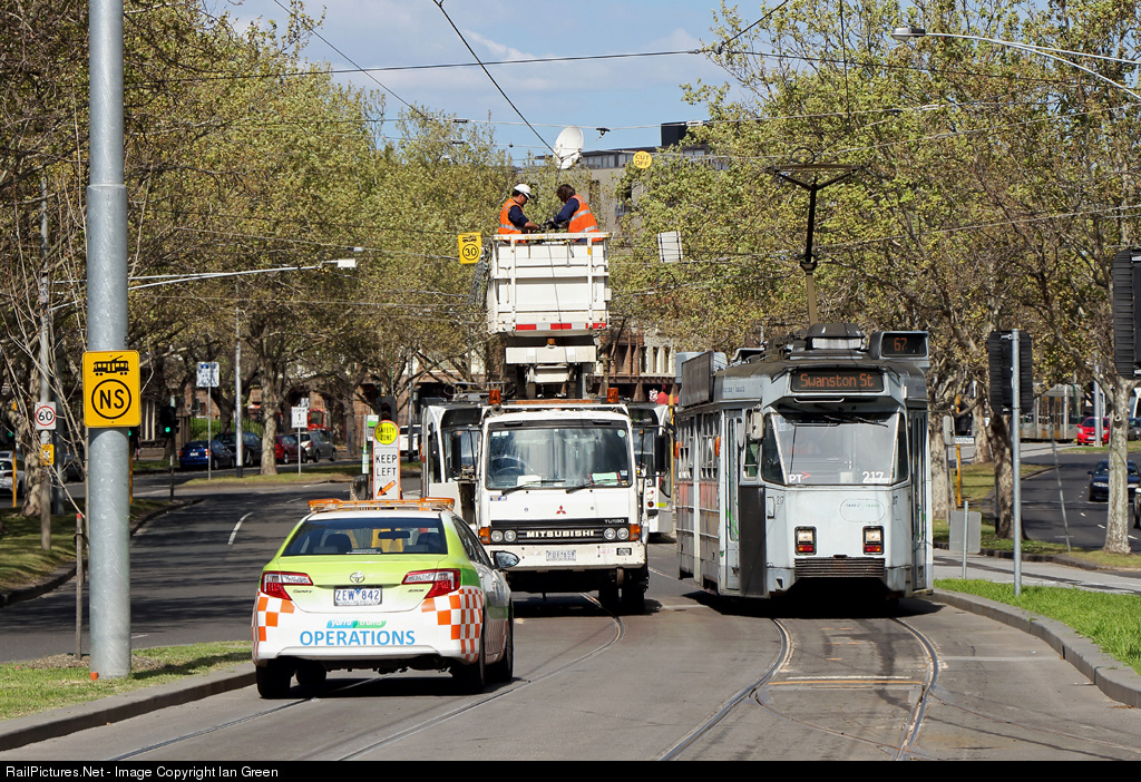 Yarra Trams infrastructure crews work to rectify a fault with the overhead trolley as 217 eases past.