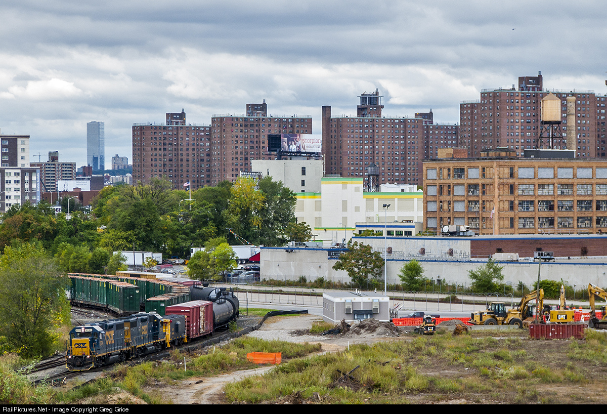 CSX local B749 makes it's way around the Waste Management trash facility on it's way to Oak Point Yard on a gloomy day. The South Bronx skyline drapes the background.