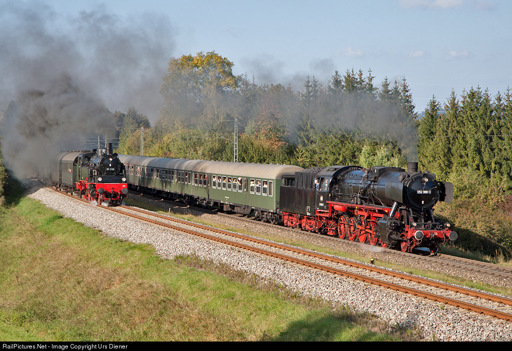 | Parallel run of two steam trains during the Rottweiler Steam-Days. 052 988 of WTB Wutachtalbahn is leading train DPE 90166 to Spaichingen. The 2-6-2T tank lokomotive on the left side, 75 1118 of UEF Ulmer Eisenbahnfreunde, is leading train DPE 90156 to Schwenningen. |