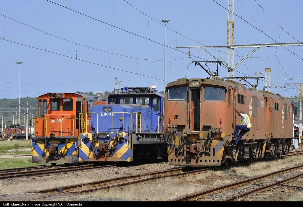 | From left to right - Class 8E (E8054) / Class 36 (36-257) / Class 8E (E8032) / Class 6E1 (E1511 & E1408). E1511 & E1408 have just arrived at Bayhead Yard to collect a load of timber wagon empties for Empangeni on the KwaZulu Natal North Coast. |