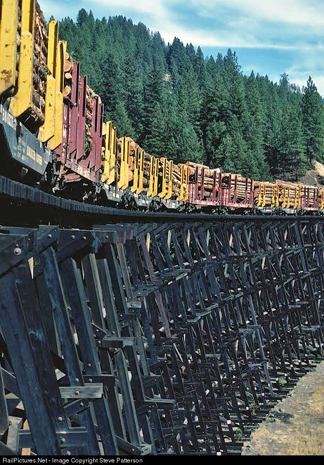 | Logs from Headquarters, Idado, sawmill cross one of many trestles on the Camas Prairie at Konkolville on Aug. 17, 1977, headed west to Lewiston. |