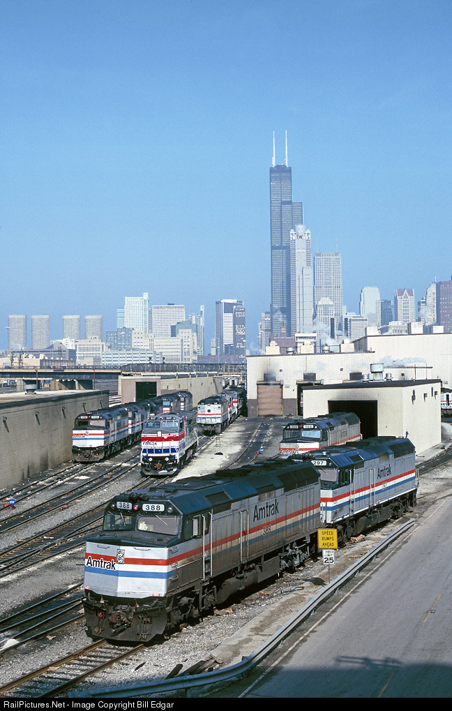 | The dominance of EMD in Amtrak's power pool is about to change as P32-8W 507 is surrounded by the old guard in Chicago. This is the first of a short series of images that depicts shooting engine 507 for Trains magazine's cover for their June 1992 issue. Mike Danneman was assigned to shoot the shot, and I went along for the ride. Mike and I worked in Kalmbach's Art Dept. at the time. |