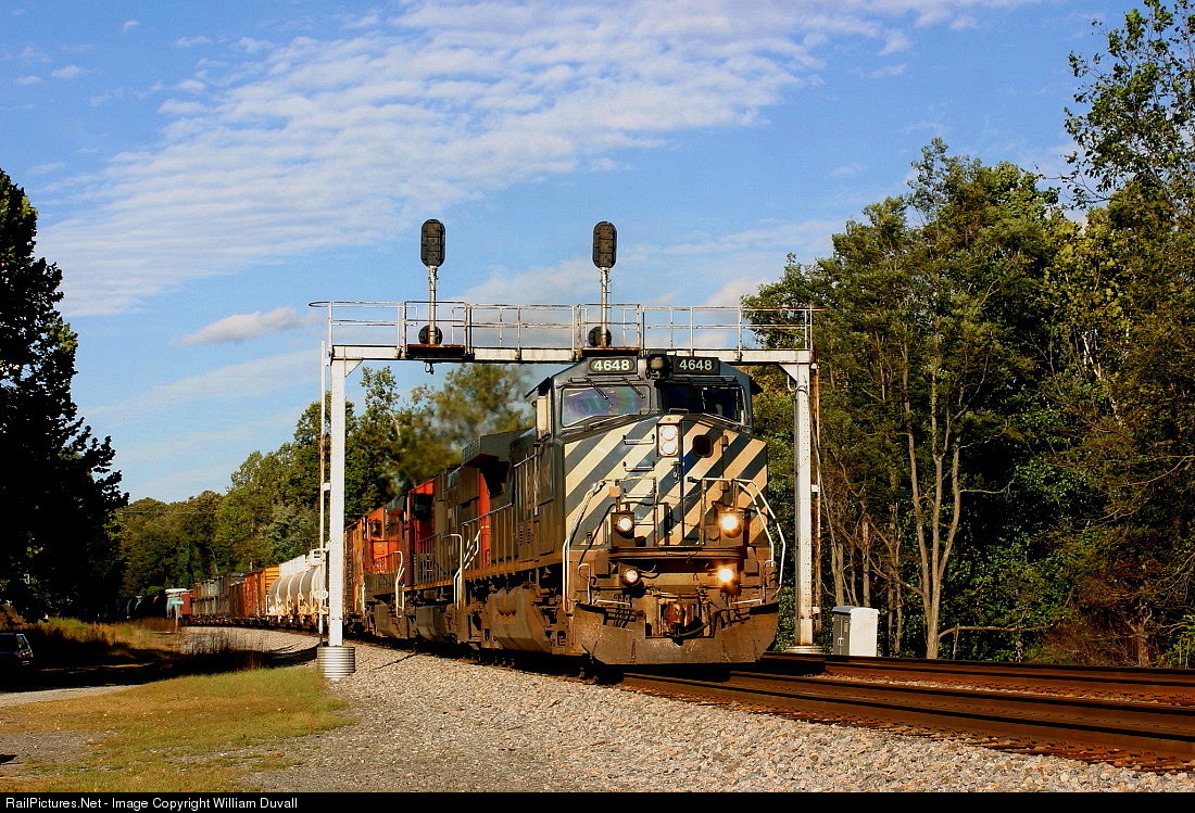 BC Rail, Canadian National and BNSF locomotives lead a southbound general manifest train under the Southern Railway signal bridge at milepost 150 on the Norfolk Southern Piedmont Division.