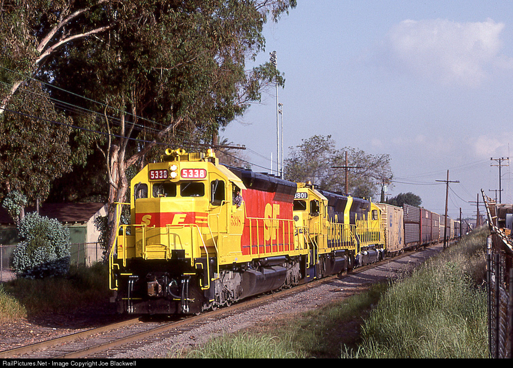 In fresh not to be SPSF red yellow paint SD 45 5338 leads a westbound Santa Fe "extra Harbor" passed Torrance Park in Torrance, CA.
