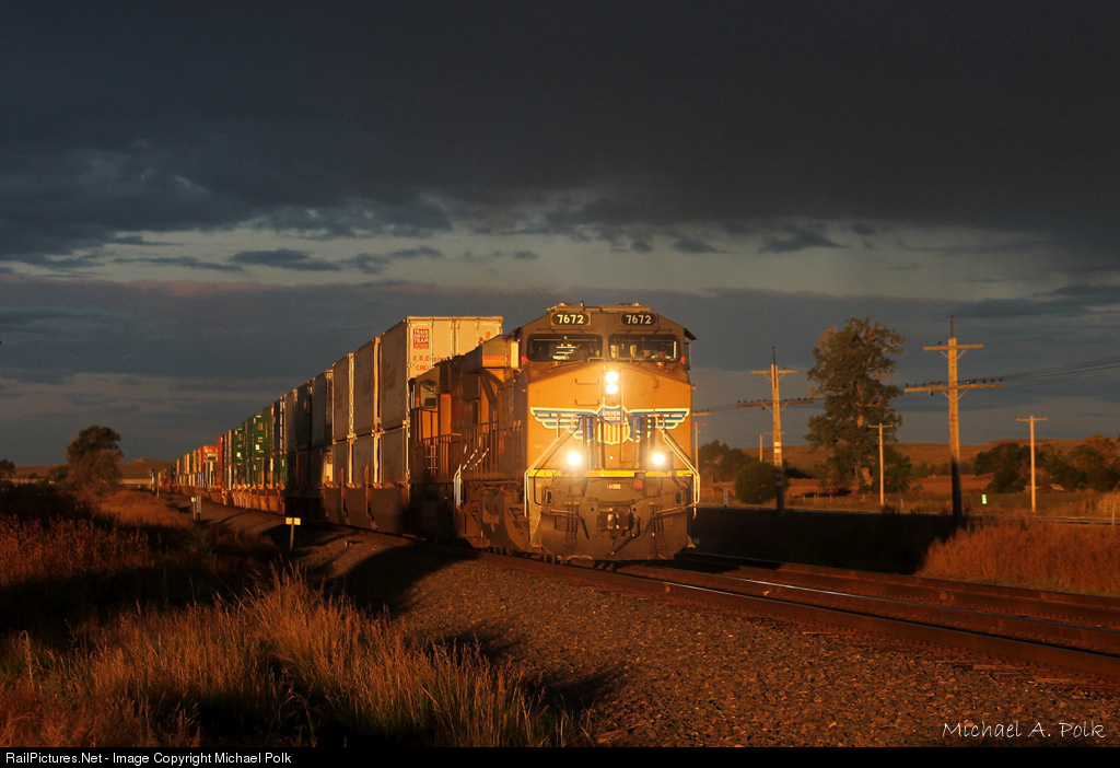 | A UP stack train races East into the early morning sun, under threatening skies forming over the Nebraska plains. |