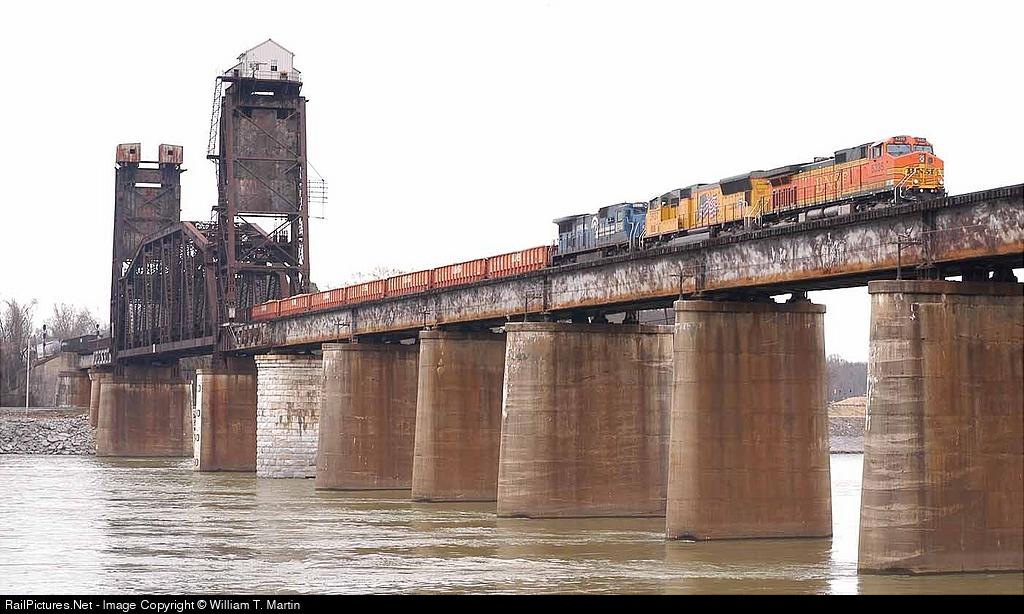 BNSF, UP, and Conrail power pull a freight across the Tennessee River