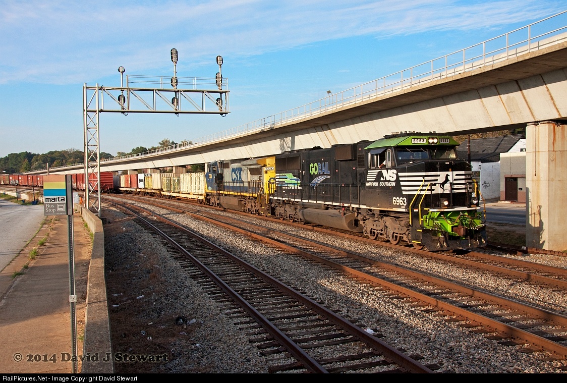 | Norfolk Southern's Go Rail SD60E NÂș6963 leads a Military train across CSXT and is seen passing through Atlanta, Ga. on it's northbound journey. On behalf of the Go Rail entity, the 6963 and the train its pulling represented itself quite well as non train enthusiast were seen from transit stations taking pictures and videos with their cell phones. |