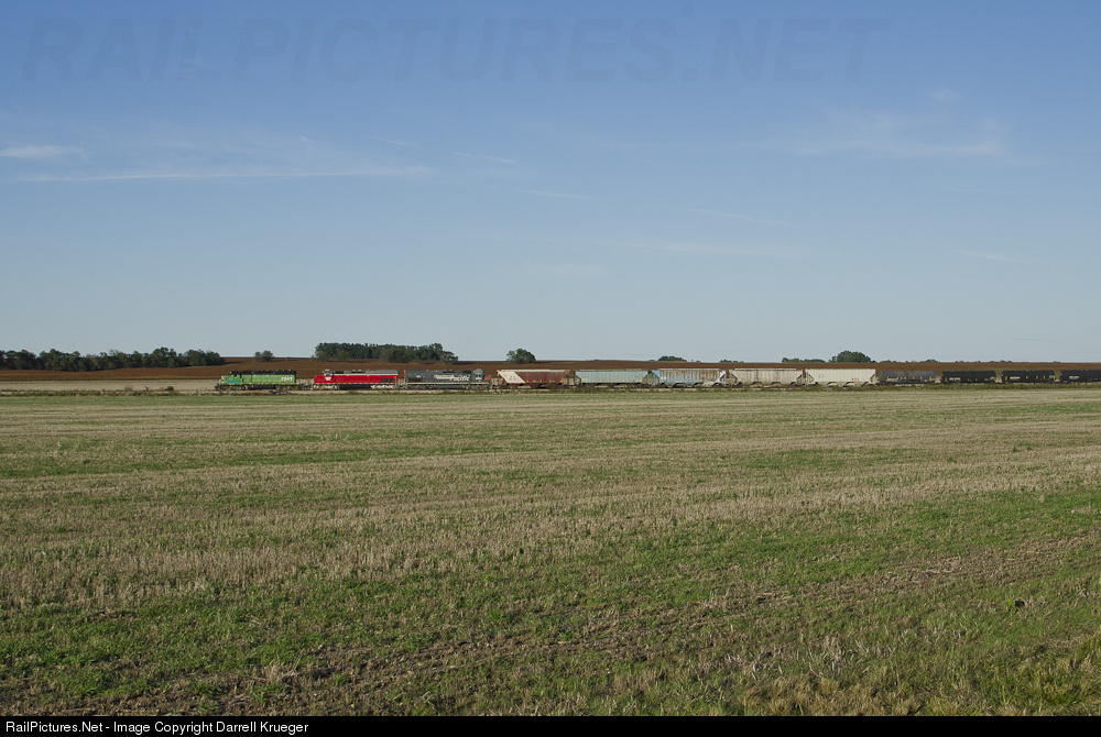 | A manifest freight from Salina heads west on the southeastern-most leg of the KYLE. The locomotive consist is an eclectic mix of tunnel motors and an ex-Frisco SD40-2. |