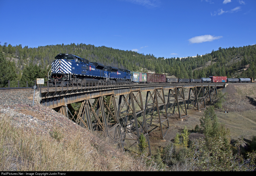 Greenhorn Trestle:Two of Montana Rail Link's new SD70ACes, Nos. 4401 and 4400, lead the westbound LM across Greenhorn Trestle on the Mullan Pass grade on Oct. 4, 2014. Three more SD70ACes and two SD40-2XRs shove hard on the rear of the train bound for Missoula.