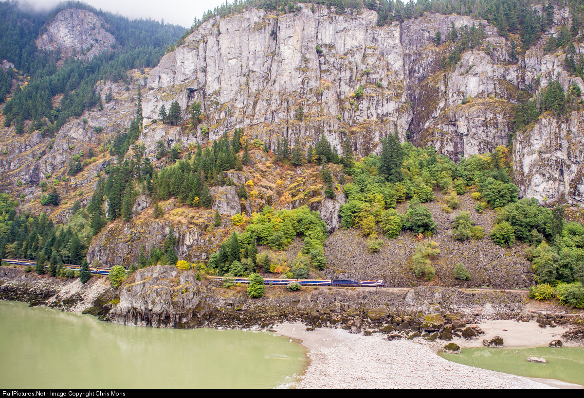 | The westbound Rocky Mounntaineer from Banff Alberta to Vancouver British Columbia, deep in the Fraser River Canyon, on its return to Vancouver B.C. |
