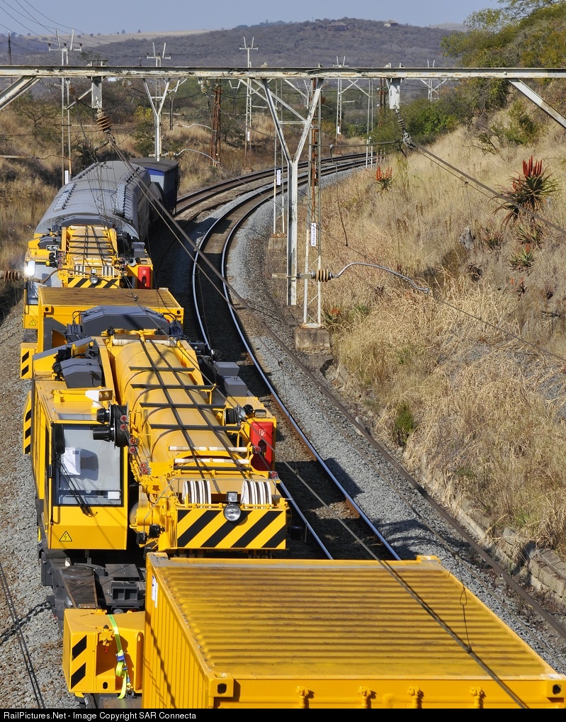 | Brand spanking new and on their way to Pretoria, running contra flow while passing through the cutting out of Ashburton Station here is Transnet Freight Rail's (the first two of six ordered) imported 160T breakdown cranes (built by Kirow - Germany), No. 601 and No. 602. They arrived in Durban, South Africa by sea. |