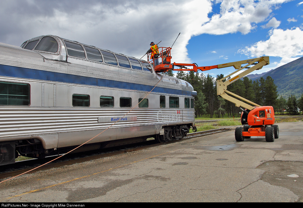 The rear dome windows of VIA Rail dome-observation “Banff Park” on the rear of train No. 2, the eastbound Canadian, gets a thorough washing on the platform during the station stop at Jasper, Alberta, on July 13, 2013. With large summer trains, it looks like the employee could use another length of hose or two!