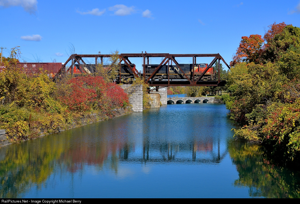 CN 327 with IC 2697 and CN 2115 is crossing the now out of use Soulanges Canal on its way to interchange with CSXT at Huntingdon, Qc.