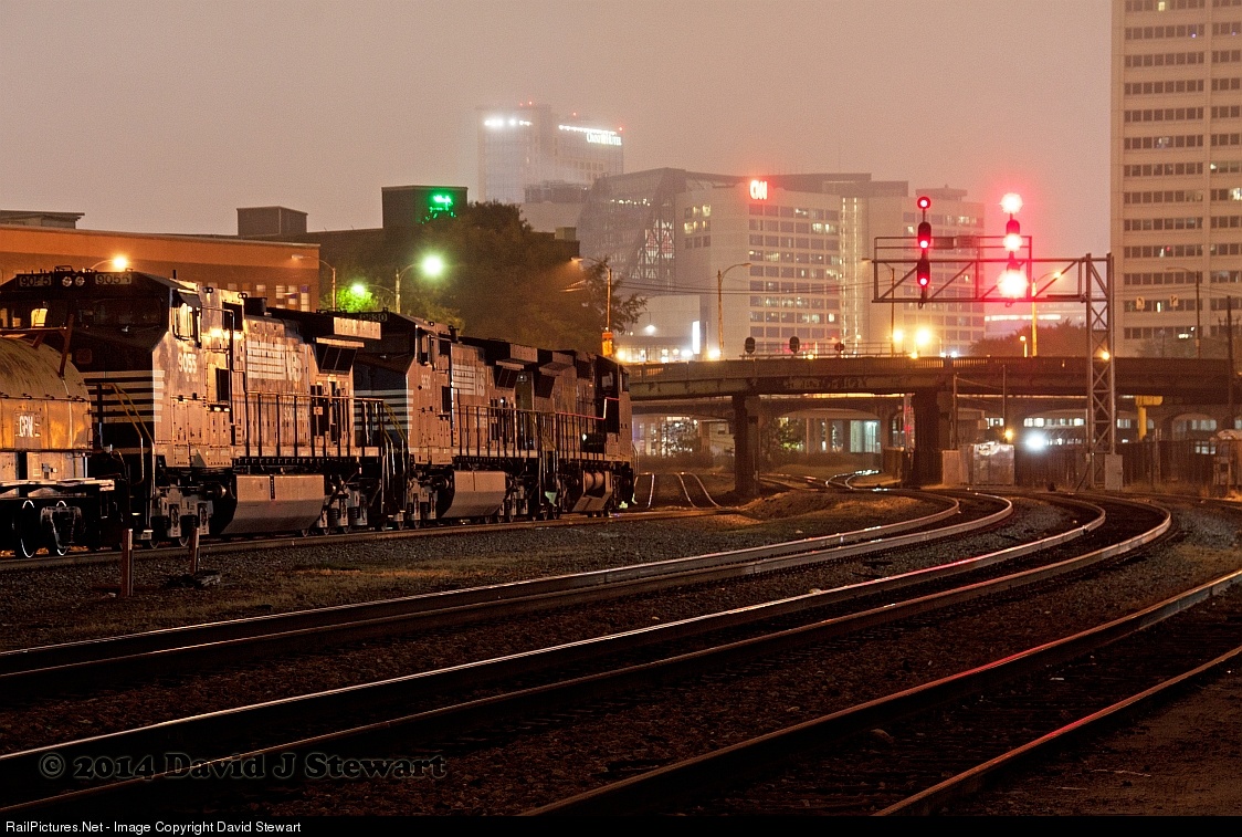 As a thick layer of overcast and dense fog move in across the sleeping City of Atlanta, Georgia during the early morning hours of October 13,2014, Norfolk Southern train 174 looks on from NS's Atlanta South District of the Georgia Division. 174 along with a 53W, an empty grain train standing in the next block north of the Spring Interlocking continues the waiting game. Just ahead in this view was the location of the City's once grand Terminal Station which was demolished in 1972. Terminal Station opened in 1905 and during the bustling 1920s, it was rumored Terminal served up to 86 trains per day. All that remains today is 200' of platform that is occasionally used for NS business themes along with the South Terminal interlocking tower.