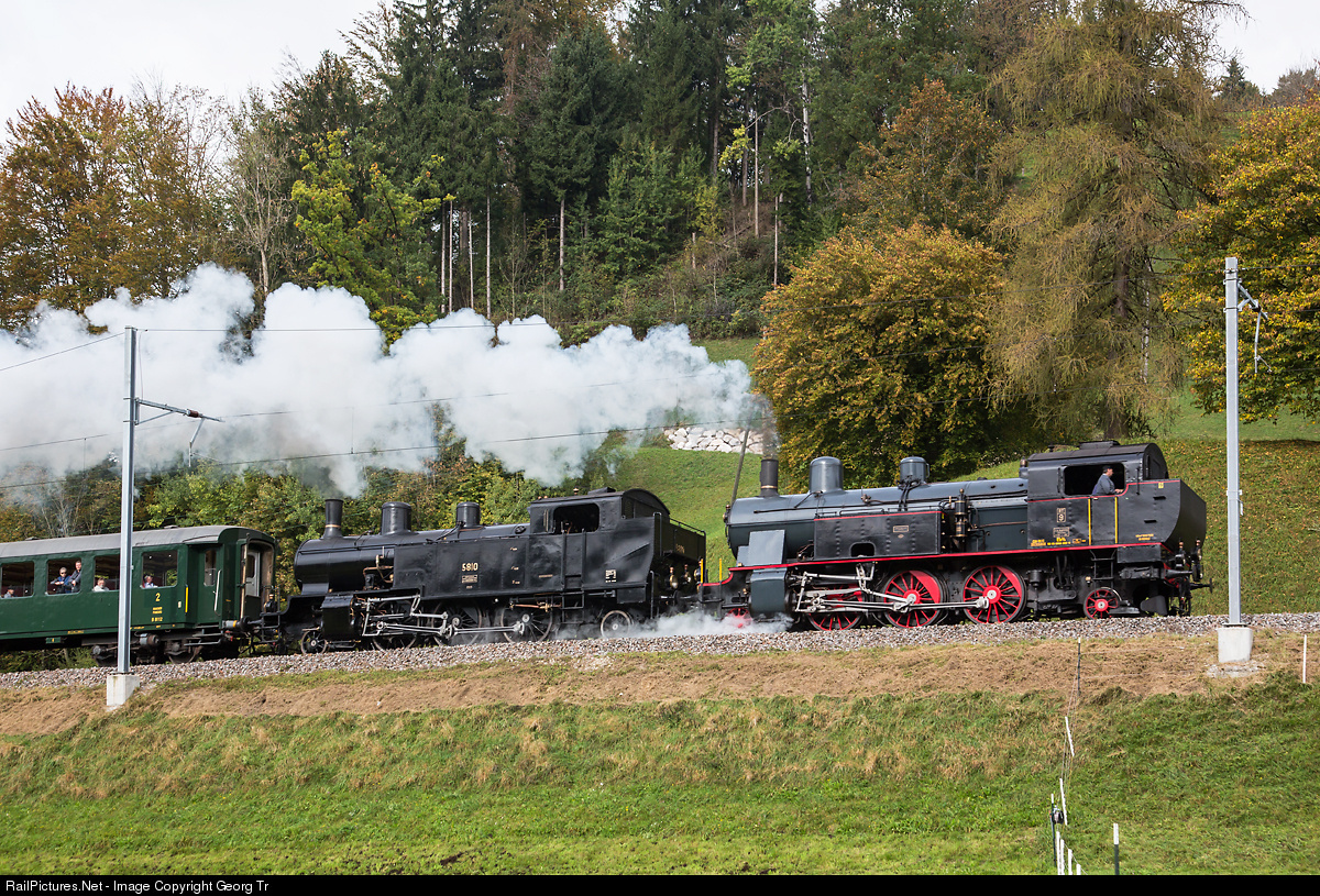 | "Maffei" Eb 3/5 # 9 of DVZO and "SLM" # 5810 of Dampfbahn Bern are pulling train 30651 from Bauma to Wald near Steg. |