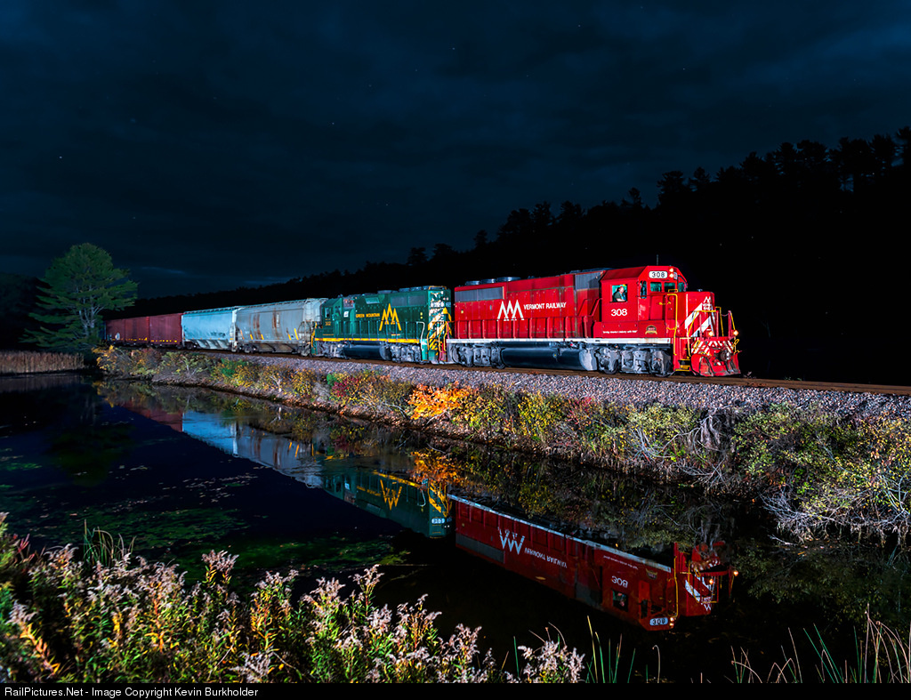 | Taking advantage of a late start from the north end, a shot I wanted to get with the shorter days was this one along the Connecticut River at Norwich, Vermont on the Washington County Railroad. The NPWJ - Newport to White River Junction - train is seen under dramatic dusk skies with the ex-Boston & Maine turned Vermont Railway GP40-2 308 and GMRC GP40 302 leading the 34-car train on the final few miles into White River Junction. A light cloud cover allowed the stars to shine through with constellations notable! Scene was lit by four AB1600 units at full power with appropriate spacing at ISO 400, 1/250th and F5. |