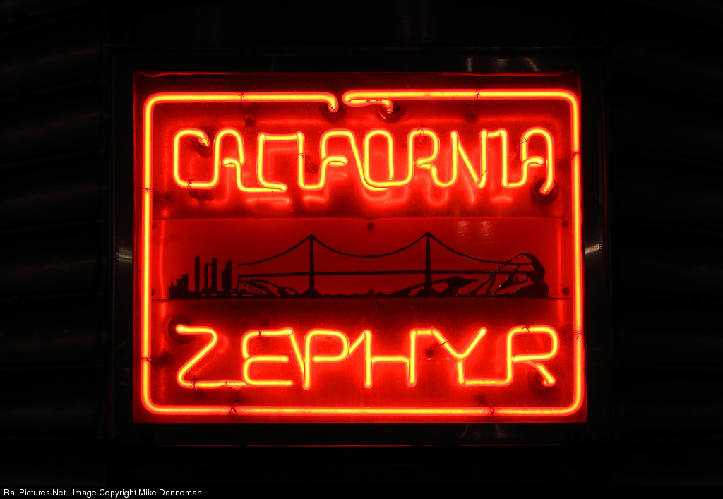 The colorful neon light tail sign of Chicago, Burlington and Quincy California Zephyr dome-observation “Silver Solarium” glows on the evening of October 15, 2014, at Denver, Colorado.