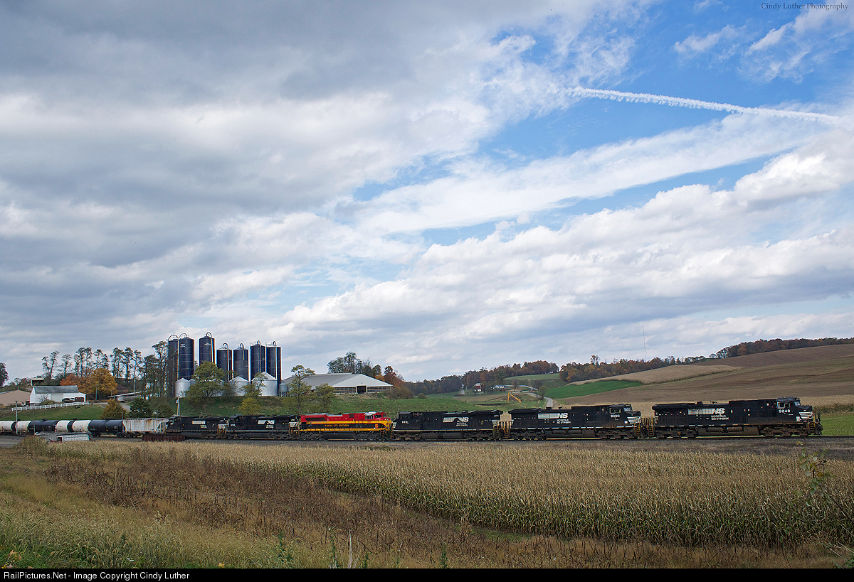Norfolk Southern 64R, with a nice splash of color, passes by a local barn just off of Bayard Rd near Minerva, Ohio. This train, as well as five others, took a detour route down the Bayard Connection in Alliance because of the traffic increase this past month.