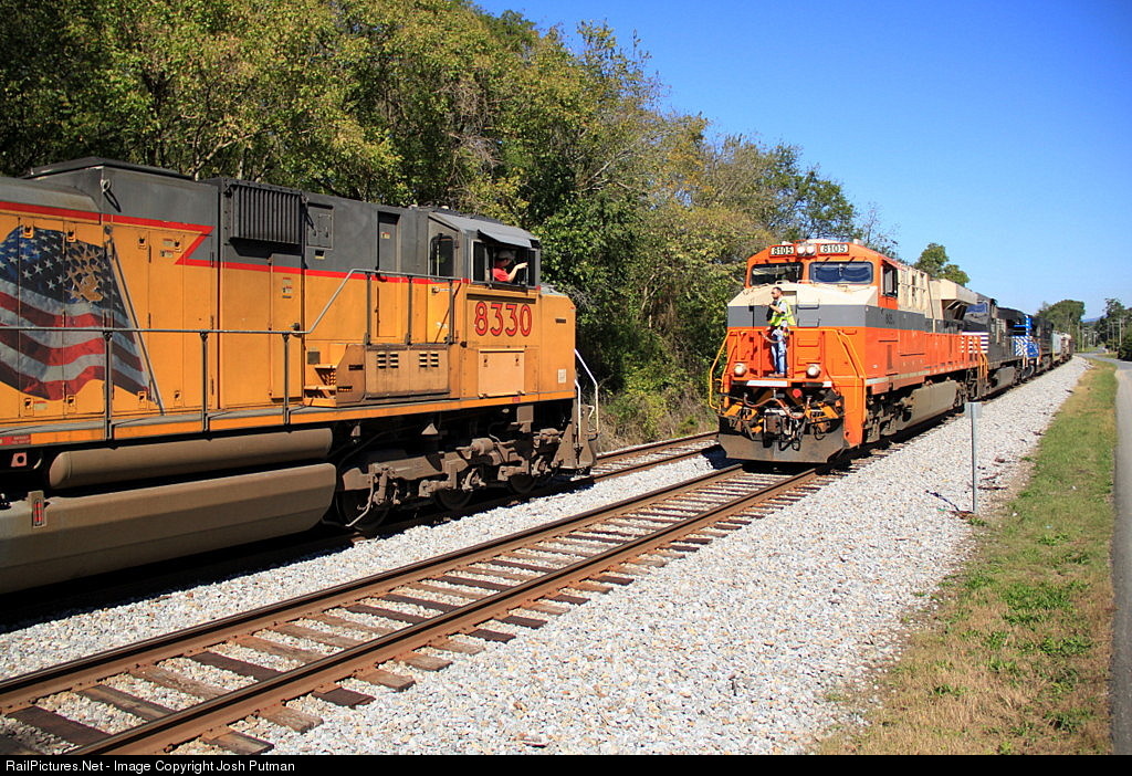 Everyone is in good spirits today on the railroad as Engineer McDaniel on train 164 (UP 8330) greets Conductor Walker on train 367 (NS/Interstate 8105) as 164 takes the siding at the south end of Fort Payne to go around 367 and continue on north towards Chattanooga, Tn.