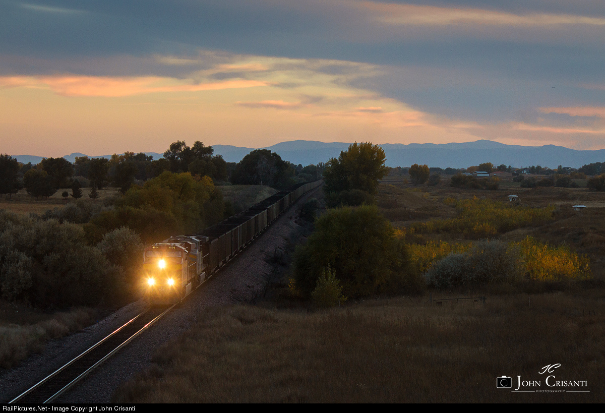 Kansas City Southern ES44AC no. 4684 leads a KCS Grey AC4400CW on this eastbound BNSF empty coal train just after sunset at Tonville, CO.