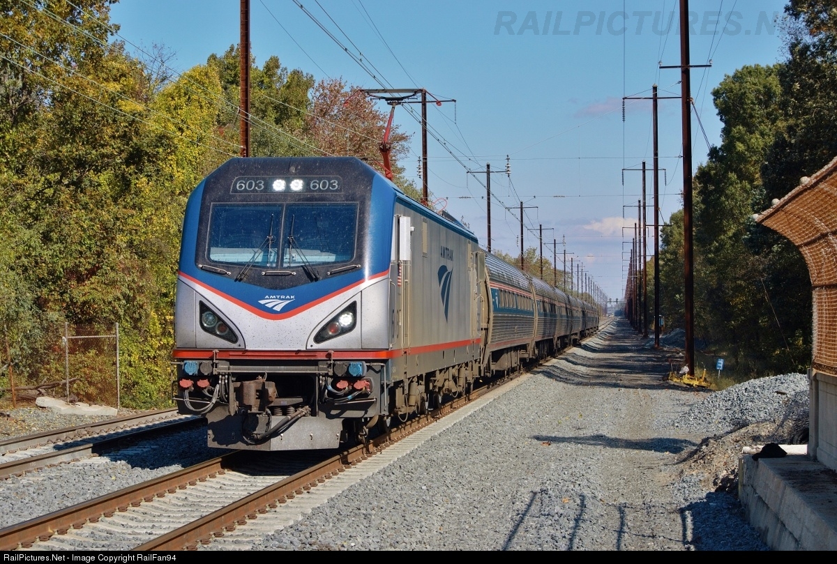 | The sun is shining on a gorgeous fall afternoon as AEM-64 #603 leads train #151 south through the Edgewood MARC station, running under a restricted speed as he is about to cross from 3 track to 2 track just beyond my position |