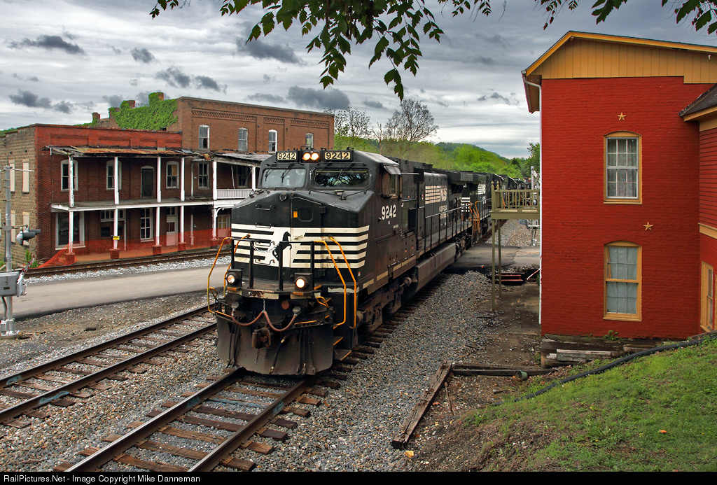 | A westbound Norfolk Southern freight passes the old hotels at Bulls Gap, Tennessee, on May 10, 2014. |