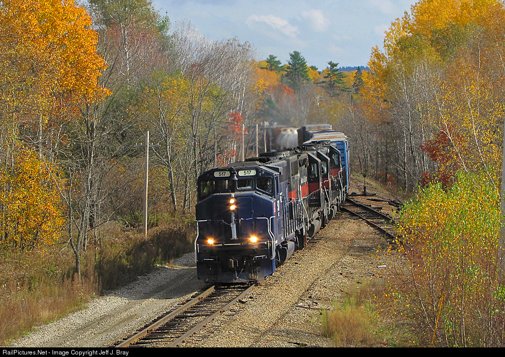 An unusually busy morning at Northern Maine Junction began to disperse with the departure of westbound NMWA for Waterville, Maine on October 18, 2014. Nearing the Public Works building and the Route 2 bridge in Carmel, GP40-2W 517 led three "Gs" past MP73 and through remains of the nearby foliage that's still holding on.