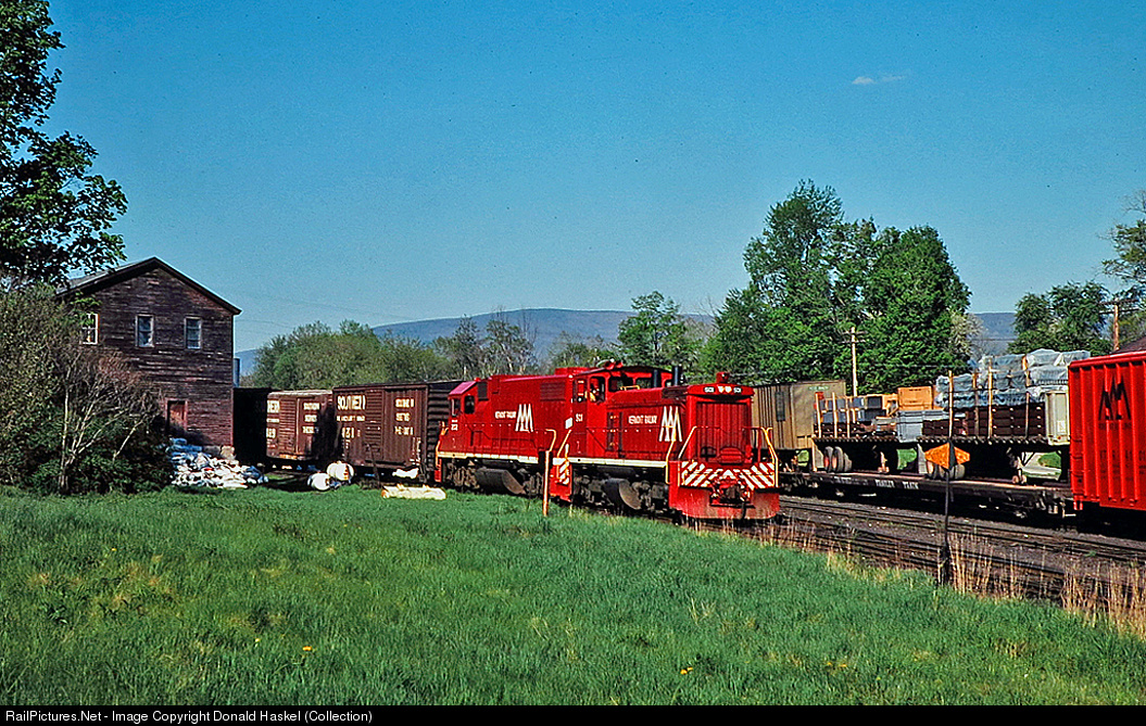VTR 501, leading GP-38 202, switching grain facility at North Bennington, VT in June 1976, having just arrived at this B&M interchange from Rutland, VT. This was the only SW1500 in Vermont in 1976.