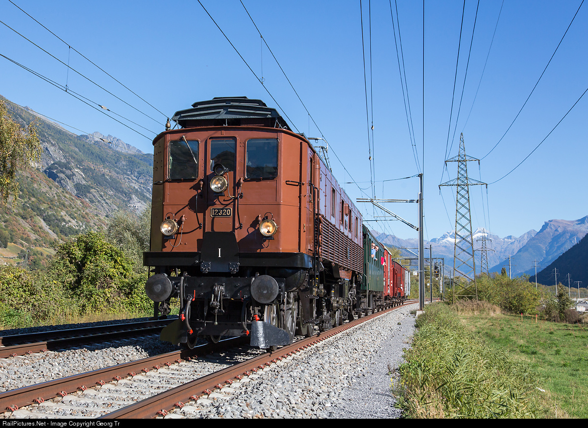 | Former Gotthard locomotive Be 4/6 # 12320 from 1921 in the Valais with a freight train including a car for passengers. The train ran from Brig to St-Maurice. |