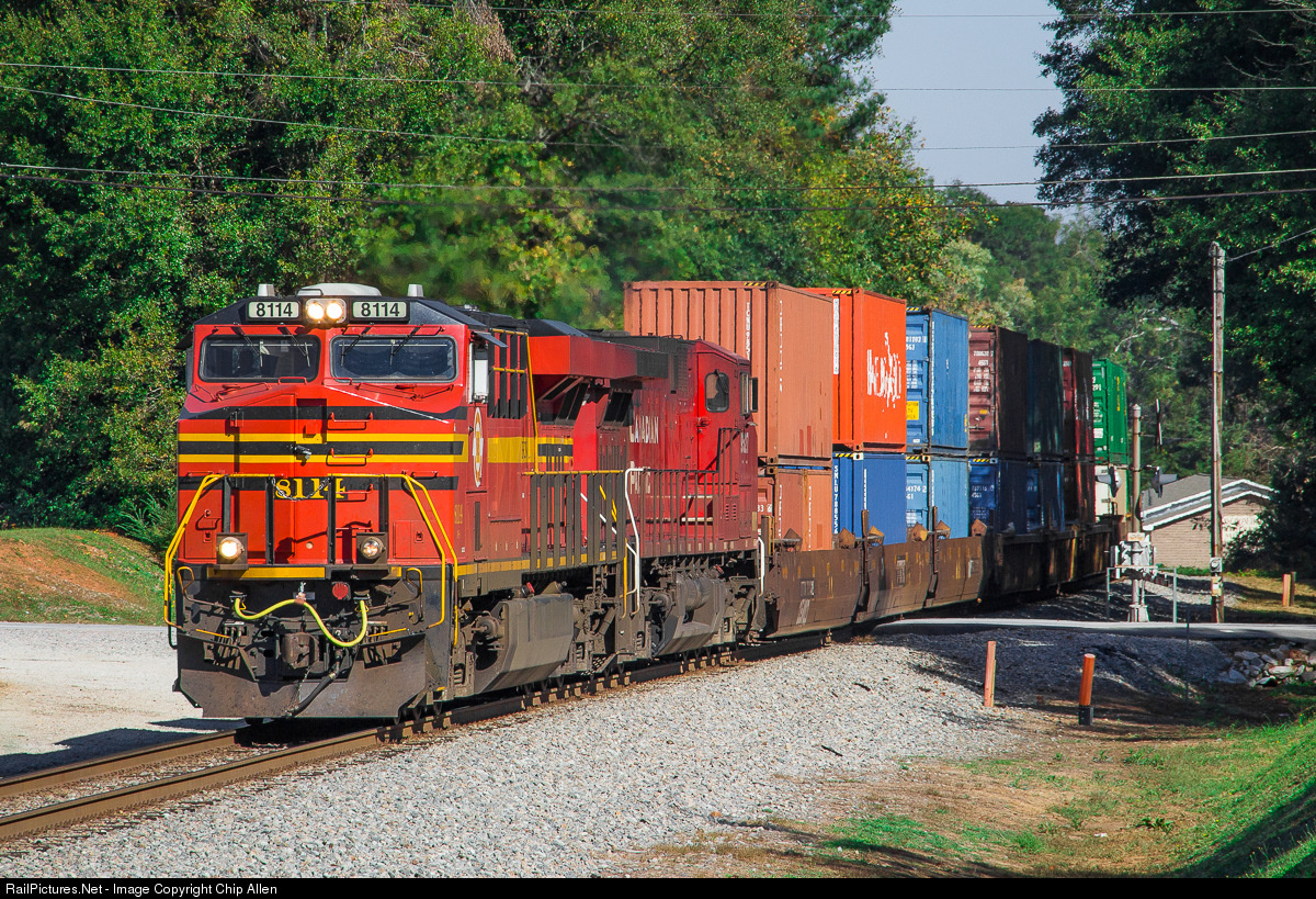 | On a gorgeous fall day in Georgia, original Norfolk Southern heritage locomotive 8114 leads train 295 southbound towards Jacksonville. Here at Stockbridge, the train is meeting northbound intermodal 231, which is in its first of several holding patterns throughout the day due to congestion around Atlanta. |