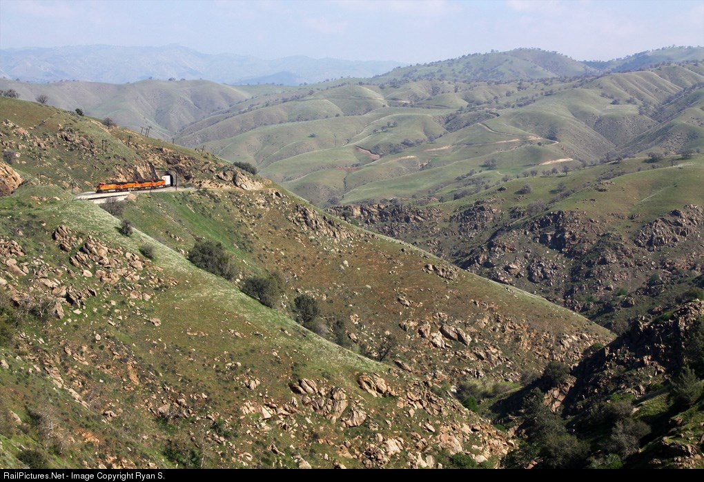 | It's not to hard to imagine how Southern Pacific came up with the station name of 'Cliff' for a isolated near 3 mile section of their famed line over Tehachapi Pass. Just east of Cliff siding and situated high above the Tehachapi Creek the former Southern Pacific line, now operated by successor Union Pacific, clings to the mountain side on a narrow shelf cut into the mountain in between Tunnels 7 and 8. Emerging from the east portal of Tunnel 7 BNSF 5497 with intermodal tonnage tied to the drawbar prepares for the 'high wire' portion of its journey over the mountain pass. |