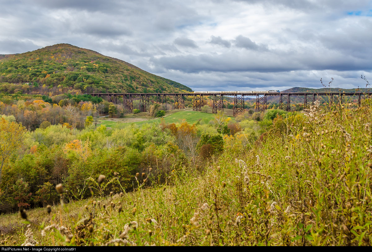 | After picking up passengers at Salisbury Mills, train 74 is pushed across the impressive Moodna Viaduct. In less than 2 hours the train will reach its destination of Hoboken. |