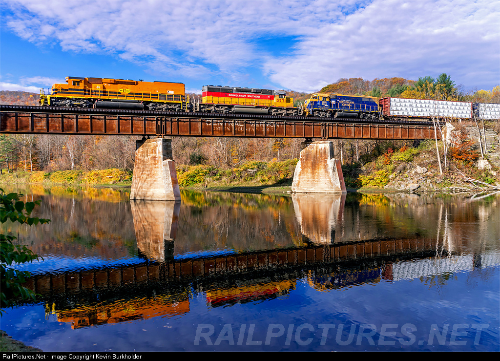 The heritage of today's Genesee & Wyoming-owned New England Central Railroad is visible on the bridge over the White River at Sharon, Vermont, as NECR train 324-20 heads southbound toward White River Junction, VT with SD40T-2 3317, Connecticut Southern SD40-2 3771 and NECR GP38 3851. Fall's last hurrah is almost as colorful as the NECR locomotive consist.