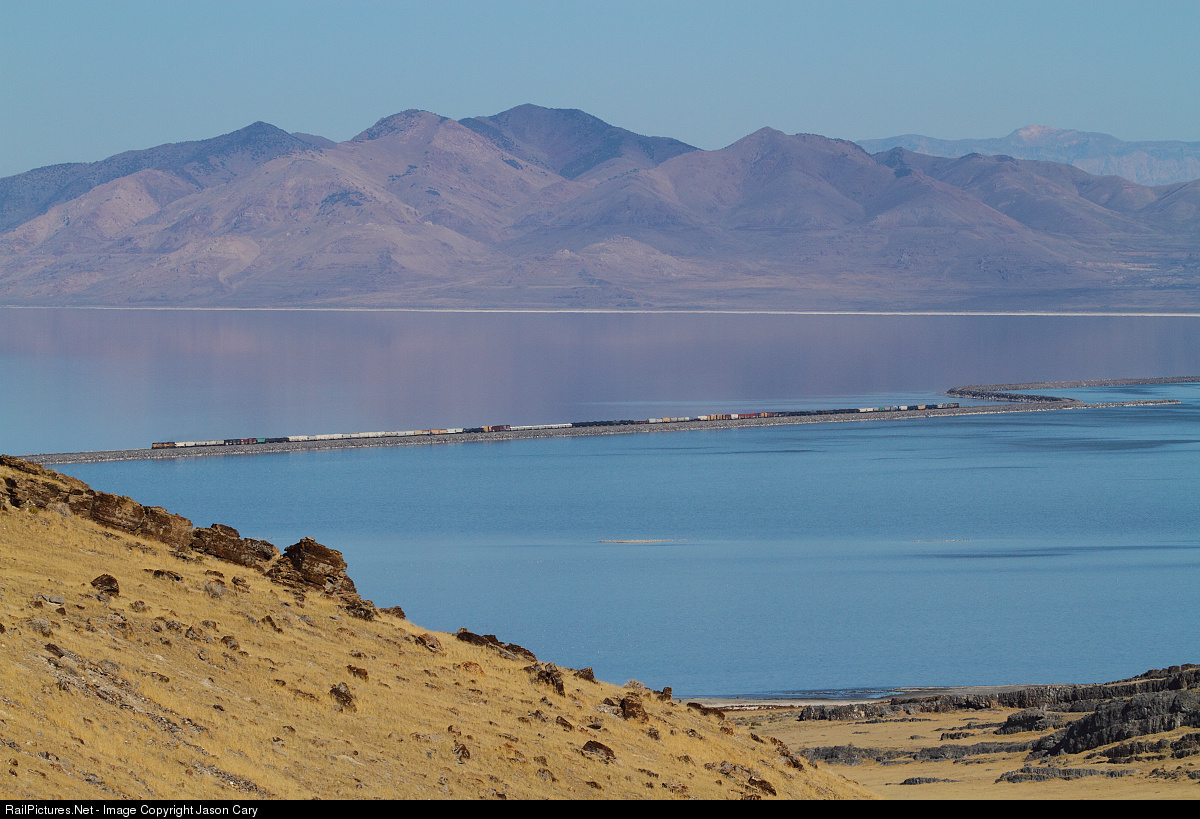 A 112 car manifest cruises along the Great Salt Lake Causeway. From my mountain top perch the smell of this great salty inland sea smells almost the same as being ocean side in California. The views from this area in all directions are stunning I look forward to going back.....