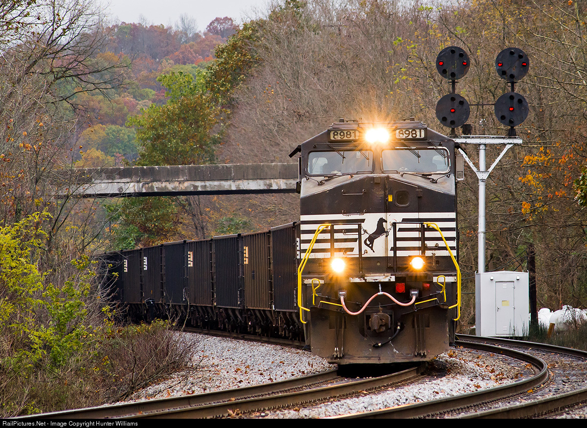 | Dash 9 number 8981 leads a Norfolk Southern coal train past the color position light signals at Falls Mills, VA as it heads west along the Pocahontas District on October 22, 2014. |
