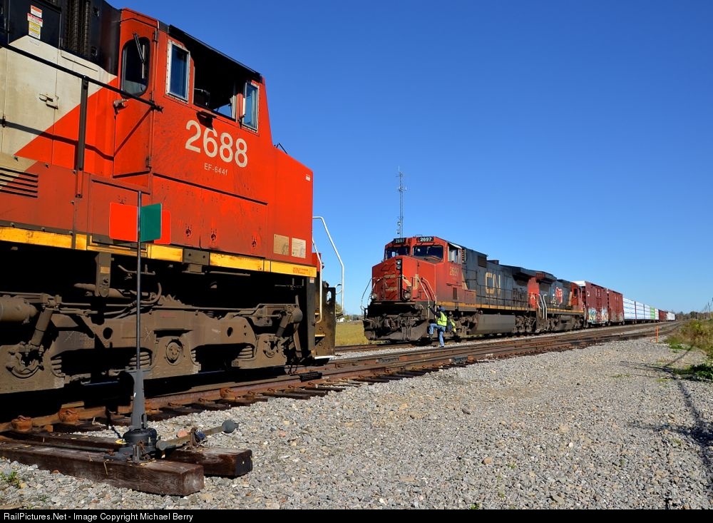 CN dash9 vs. IC dash9. CN 327 with IC 2697 and CN 2115 is in the siding at Huntingdon, Qc as CN 326 with CN 2688 & CN 5546 and a CN crew slowly depart on their way Montreal. The CSX crew is mounting the lead unit of CN 327 and will take it out of the siding afterwards and head south towards Massena, NY. Up until a few months ago this scene would have featured 100% CSX power, but as of late CN power predominates on these two run-through trains.