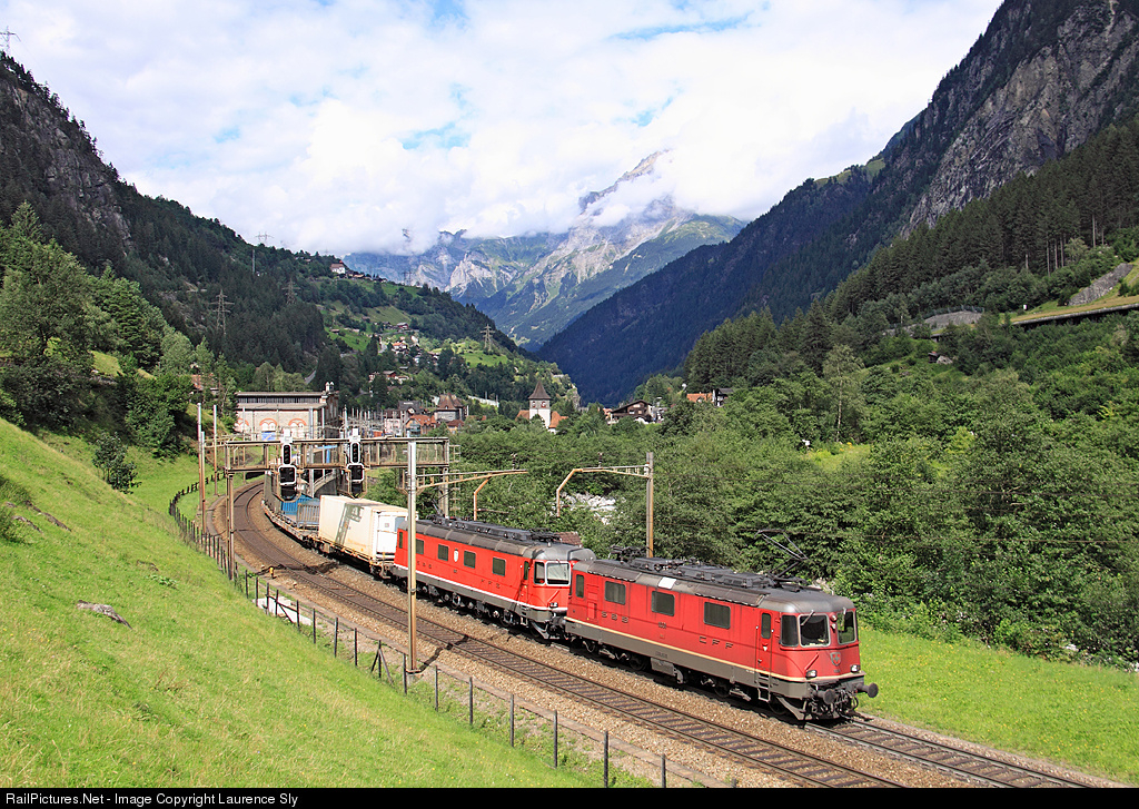 A pair of SBB locomotives haul a southbound intermodal train past Gurtnellon