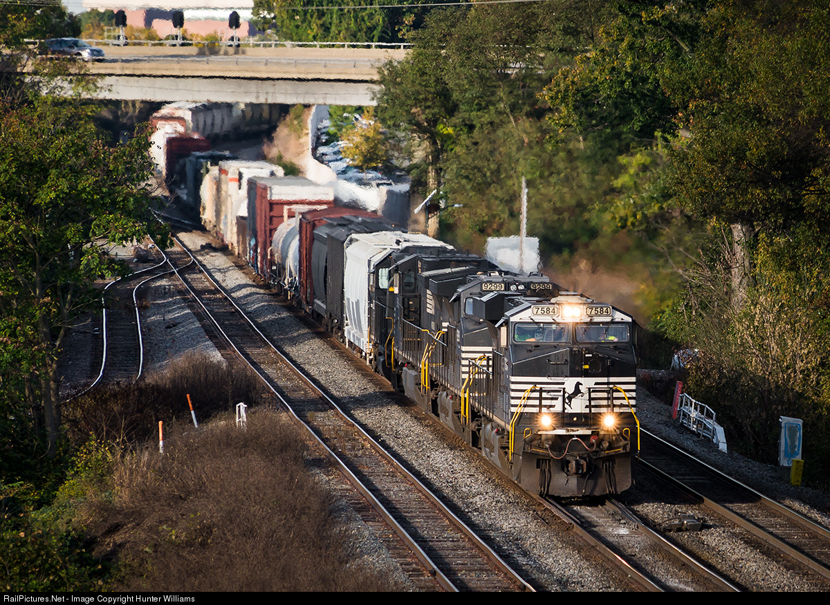 | Led by ES40DC number 7584, Norfolk Southern train 36Q rolls through the switches at Elm in Greensboro, NC on October 24, 2014. |