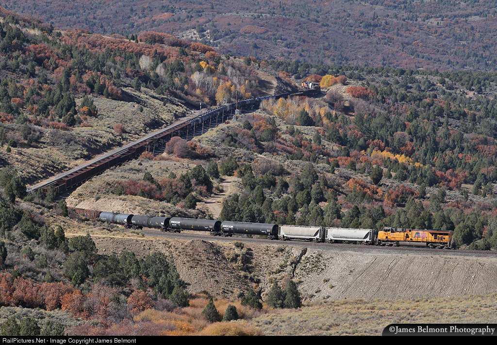 UP 7627 shoves on UP's MRONY train at East Gilluly on Oct. 17, 2014. You can see the entire 93 car train with the DPU shoving on the Soldier Creek fill and the head end approaching the upper horseshoe.