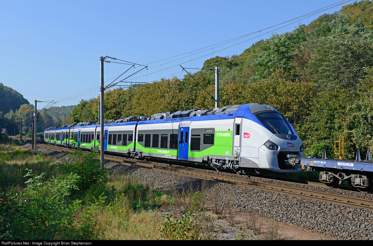 A brand new Alstom Regional Express bi-mode (electric and diesel) six-car unit No 84517 for use in Picardie is being towed by Europorte diesel No 1725..