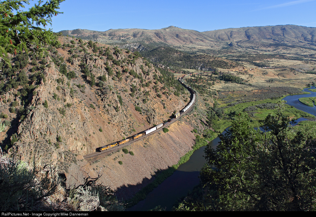 | Westbound Union Pacific MNYRO is approaching Tunnel 39 and Little Gore Canyon west of Azure, Colorado, on the morning of August 3, 2014. |