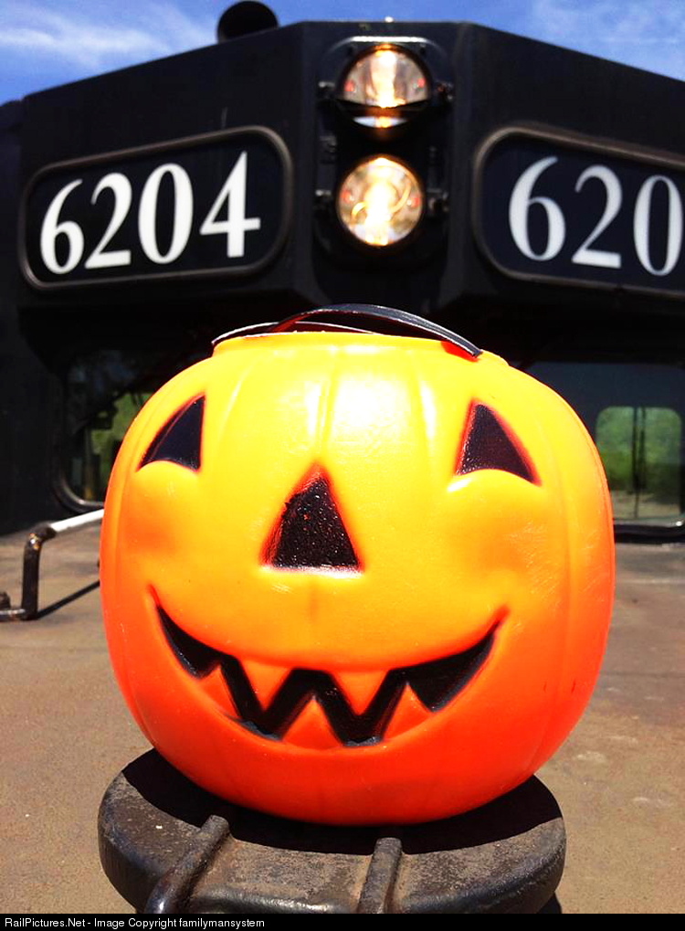 | Happy Halloween! - CN L503 crew has fun with Pumpkin, brightening up the nose of this IC SD, on a splendid October morning. |