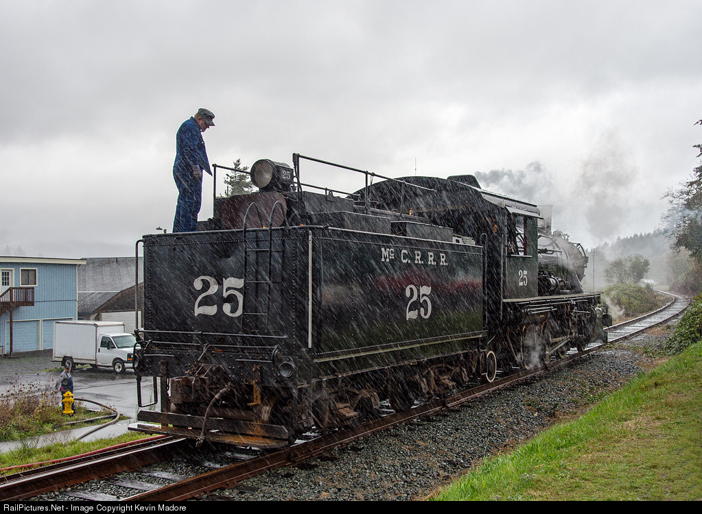 It's not always glamorous.... As I stand here in my full-body rainsuit and big rubber boots, I can't help but feel a little bit sorry for the poor fireman standing up on the tender tank, and his engineer down by the fire hydrant below as they water McCloud 25 in downtown Wheeler, Oregon. Some days, steam railroading is not glamorous. Both crewmembers are wearing cotton overalls and neither has a shred of rain protection. Both are probably wondering why they volunteered to run a photo charter on a day like this, and probably wondering even more why 30 nut-cases would be interested in taking pictures in conditions like this. Good thing the cab is pretty warm. These poor fellows would have both had a case of hypothermia within a couple of hours.