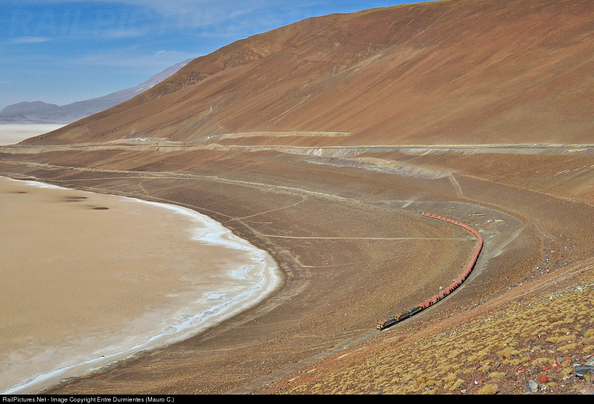 | October 2013, a small part of Carcote salt lake viewed from the San Martin slope. Westbound FCAB ore train coming from Ollague and final destination Angamos seaport in Mejillones, upward to Ascotan pass (4000m).