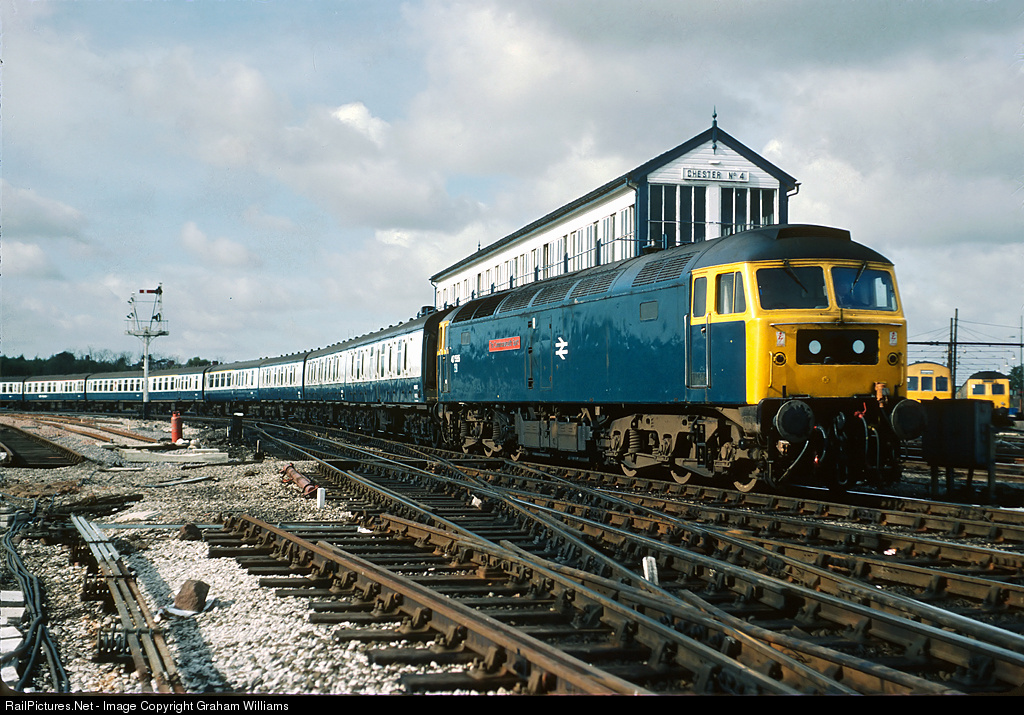 | My 1,000th photo on the RP database and a blast from the past. On a Saturday afternoon in October 1980, class 47 no. 47 555 The Commonwealth Spirit passes the signal box and enters Chester station with a British Rail service from Holyhead to London Euston. Such services have been operated by the awful Virgin Voyagers for some years now. Many of us hanker for the old days when you could catch a proper train! |