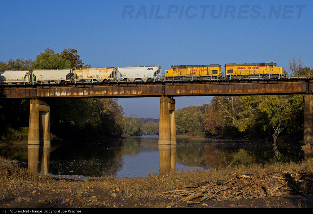 On a crisp and cool October morning, Union Pacific's eastbound "Local 59" screams across the Meramec River along the scenic Jefferson City Sub behind a pair of former MoPac GP15-1's. This job had gone west earlier that morning to do work in Pacific, MO, about 15 miles from here, and is now seen returning east toward home base..