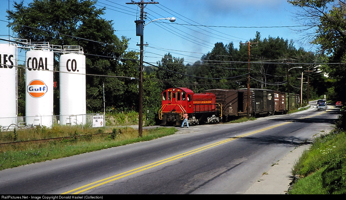 On a Monday morning run, from Montpelier Junction, Vermont, #29 a super, fresh red Alco S-1 is about to continue along North Main Street in Barre. Train had stopped to flag a road crossing at Myles Coal Co. The brakeman is about to climb on the alco's steps and ride to the next unprotected crossing. Like many Vermonter’s in the 70’s he and some of his crewmembers may own a small working dairy farm nearby which helps with the pocketbook. The Photographer added this comment. This is another shot from the Northern New England clean-up trip in August 1978 on the southern edge of Vermont’s Northern Kingdom.