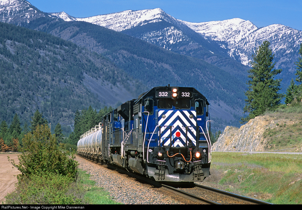 Montana Rail Link’s gas local heads eastbound west of Weeksville, Montana, on May 10, 2010. Lead locomotive MRL No. 332 has an interesting history to be told. It began life as Erie Lackawanna EMD SDP45 No. 3657, but was soon rebuilt with a SD45-2 carbody and Dash 2 electrical upgrades by EL's Hornell Shops in 1973-74 following a wreck. It then went to Conrail, and later VMV, Morrison-Knudsen, finally ending up in Helm Leasing’s fleet. MRL acquired the locomotive in January 1998, arriving on the property still in MK dark blue and gold paint. It was then rebuilt and sent to CEECO in Tacoma, Washington on July 5, 2008 for repainting into MRL colors. When the locomotive returned to home rails on October 7, 2008, it was on HPASKCK with former EL employee, Dave Franz, as engineer between Spokane and Missoula.